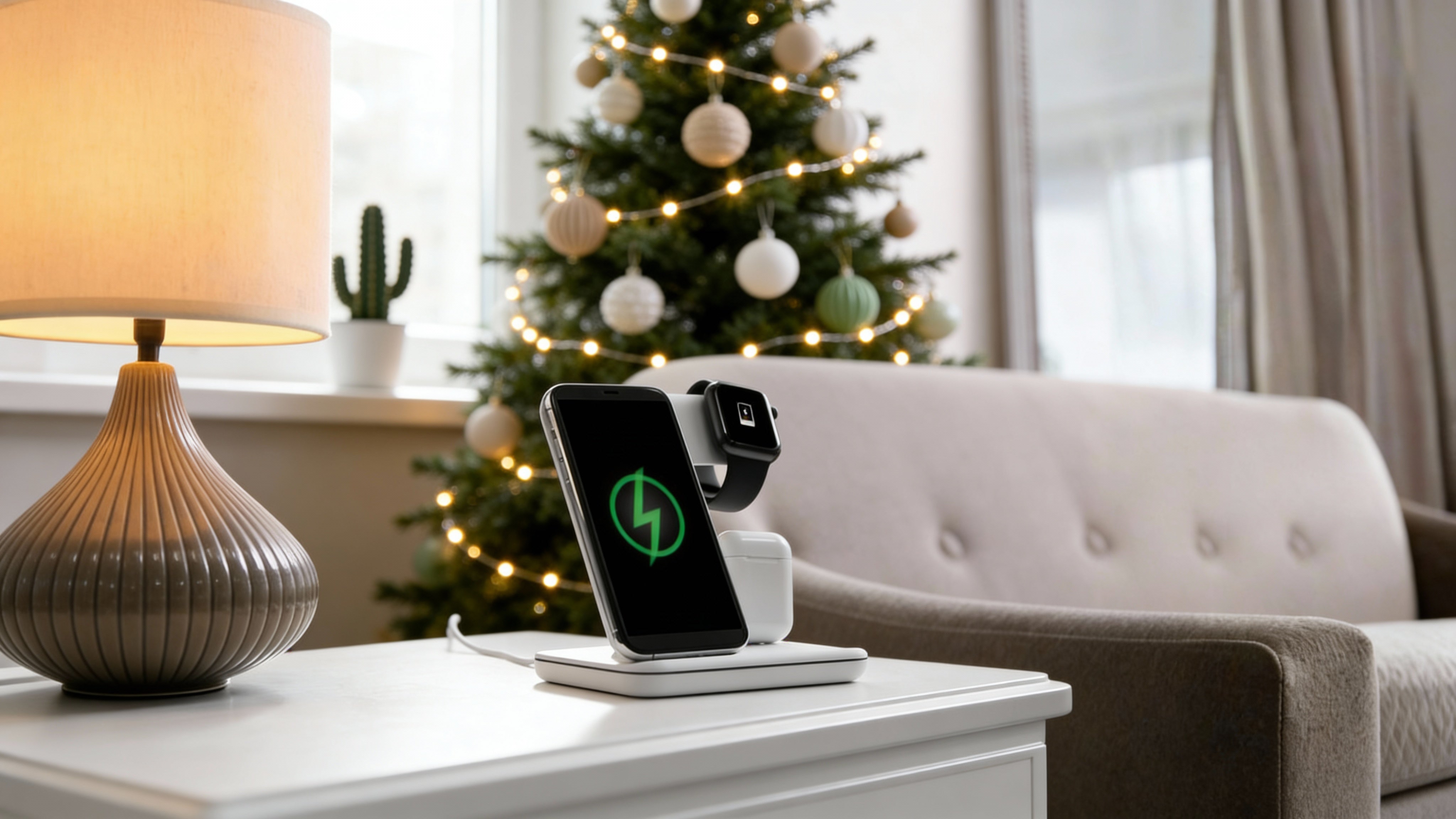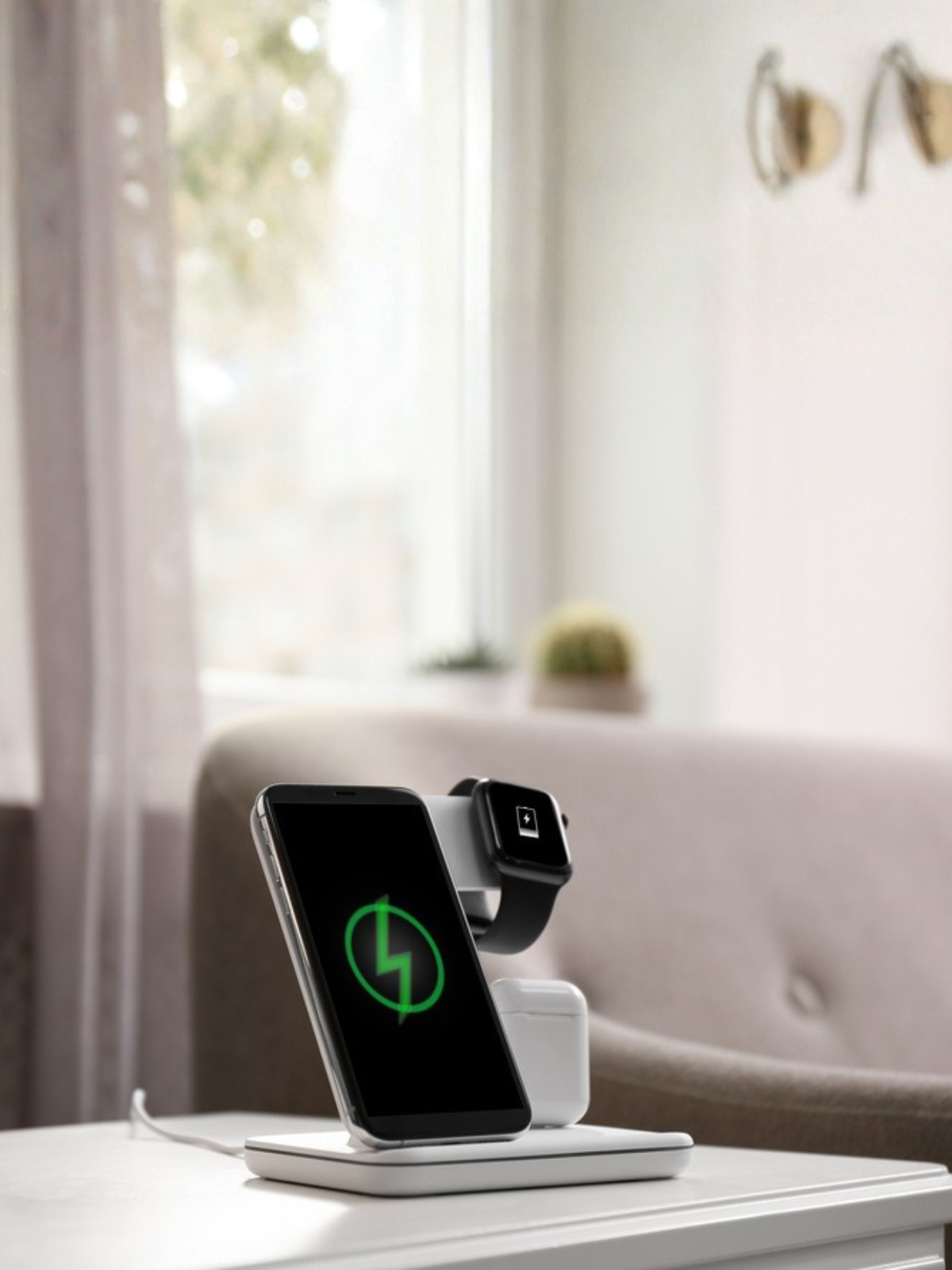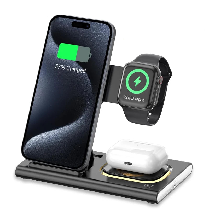 Stay powered wherever you are with a sleek 3-in-1 charger that wirelessly powers your phone, earbuds, and smartwatch from a single compact design.