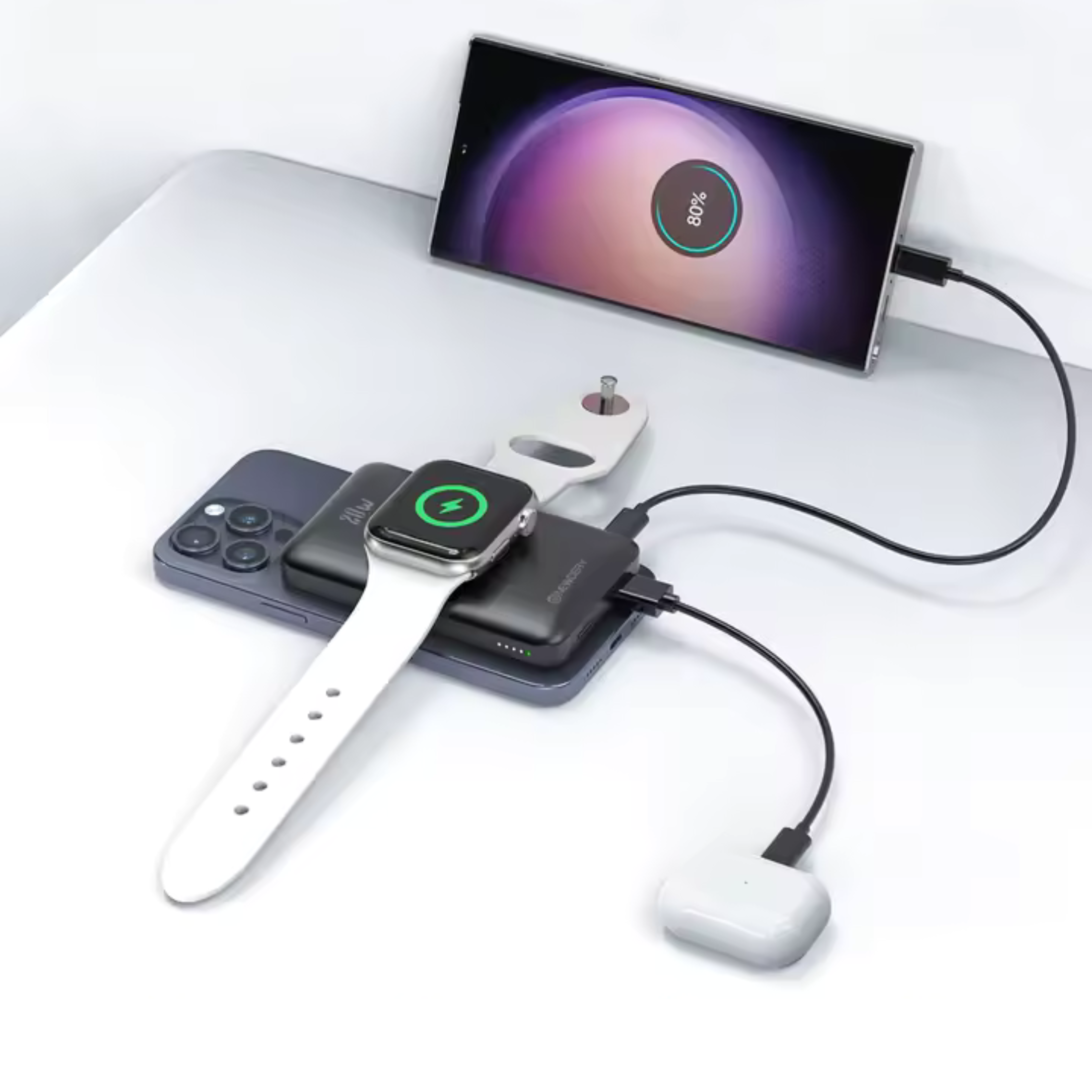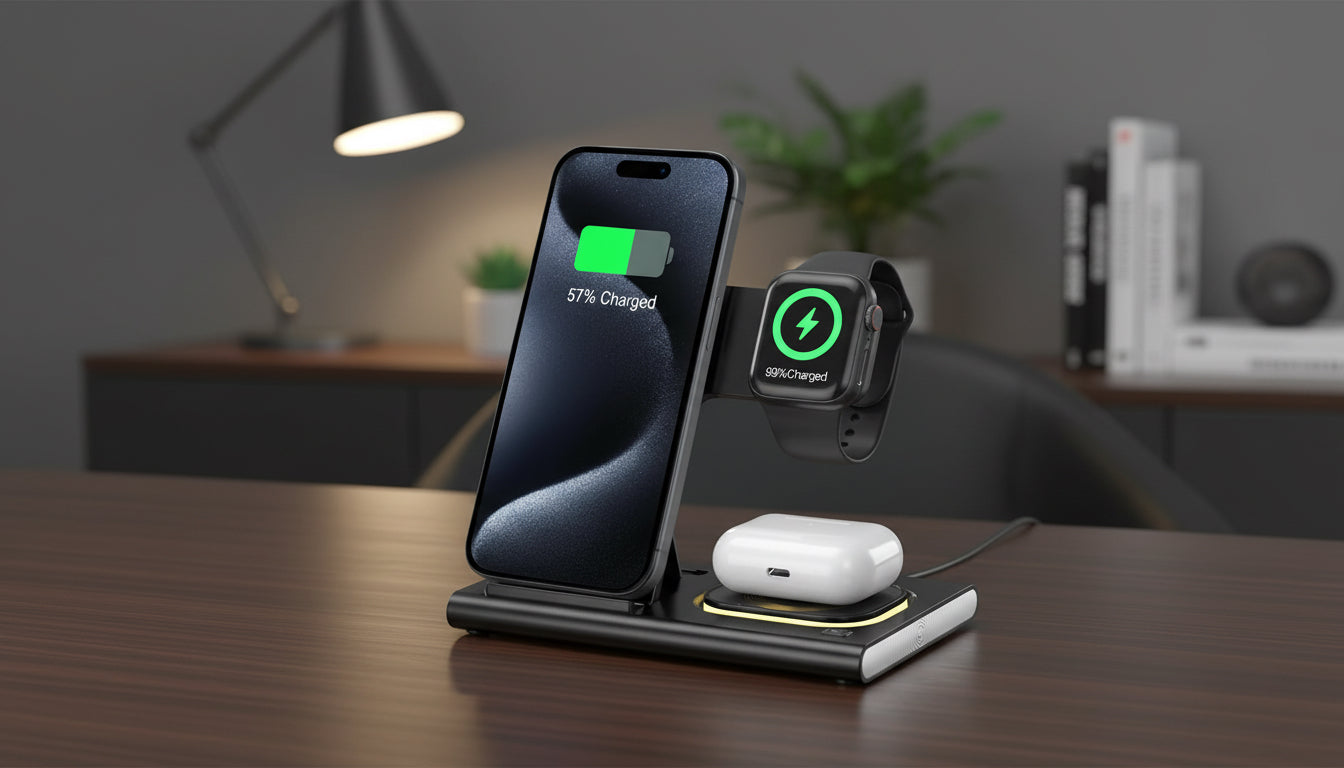 Stay powered wherever you are with a sleek 3-in-1 charger that wirelessly powers your phone, earbuds, and smartwatch from a single compact design.